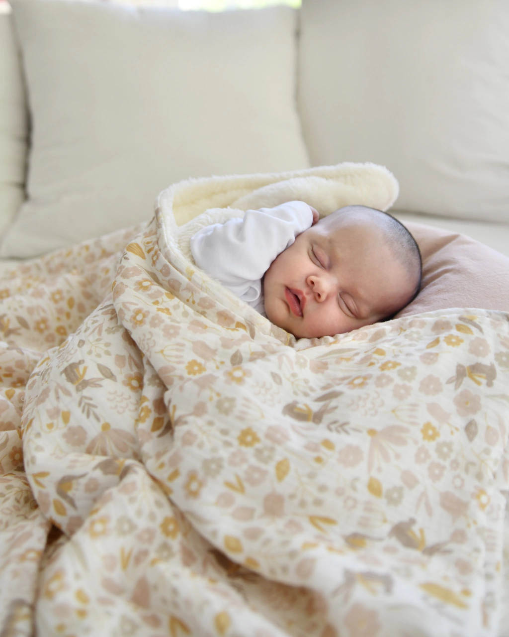 • Manta de gasa estampada, 100% algodón, combinada con corderito manteca.